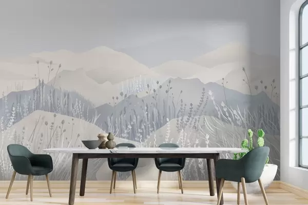 murales de pared Montañas neblinosas y campos de hierba y flores en tonos azules w02317v1