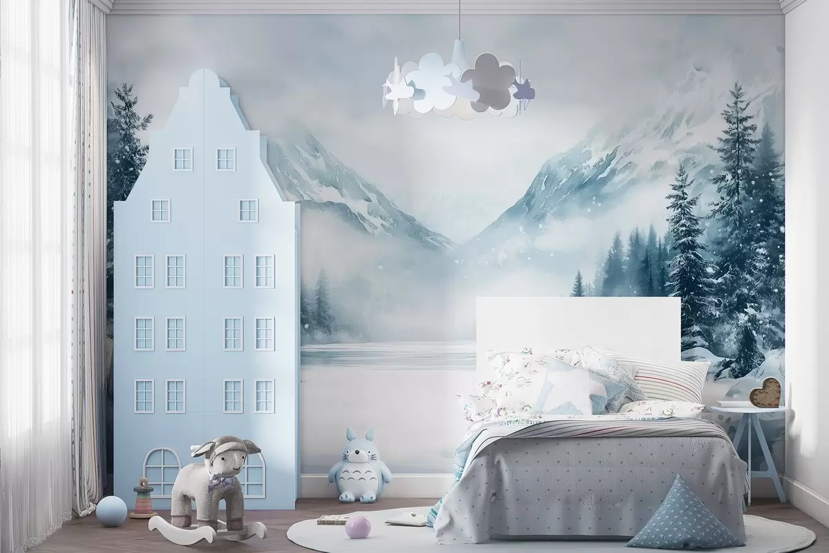 Fotomurales Montañas alpinas en la nieve, estilo acuarela, invierno, colores azules, pinos Nr. w02356