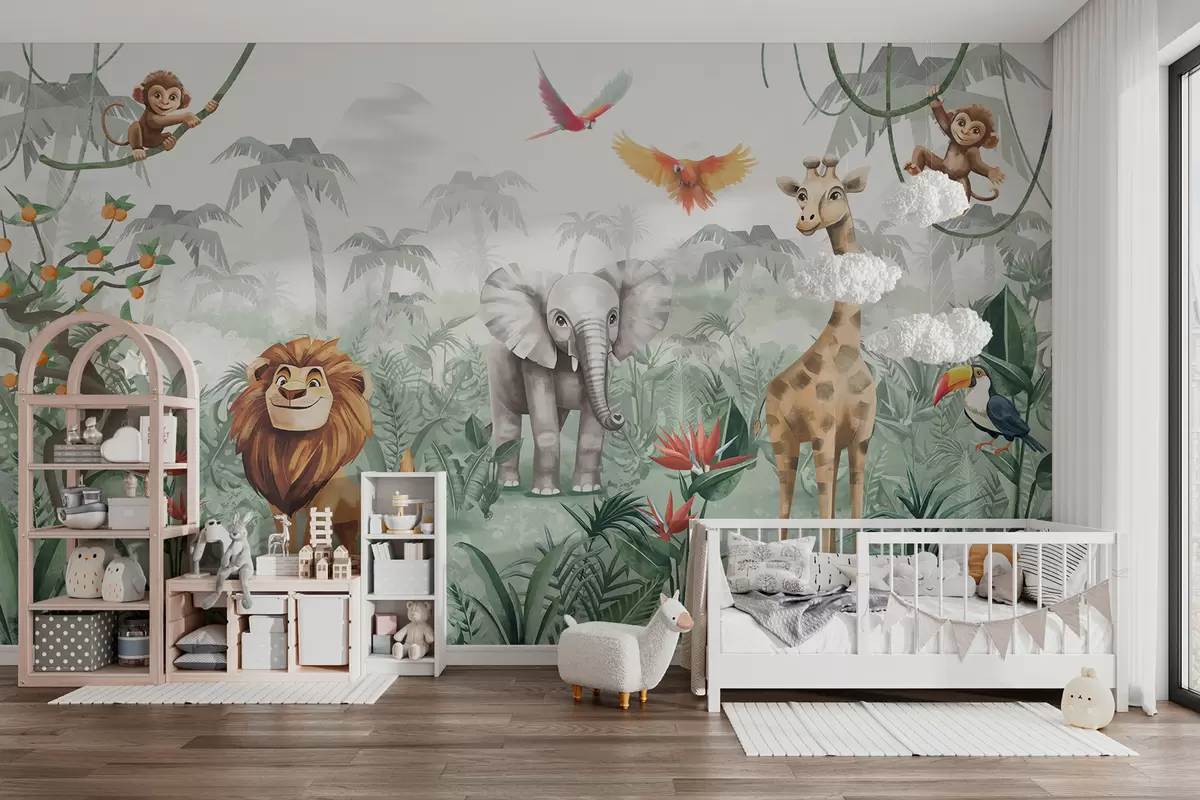 Fotomurales Diseño infantil selvático con león, jirafa, elefante y loros Nr. w02440