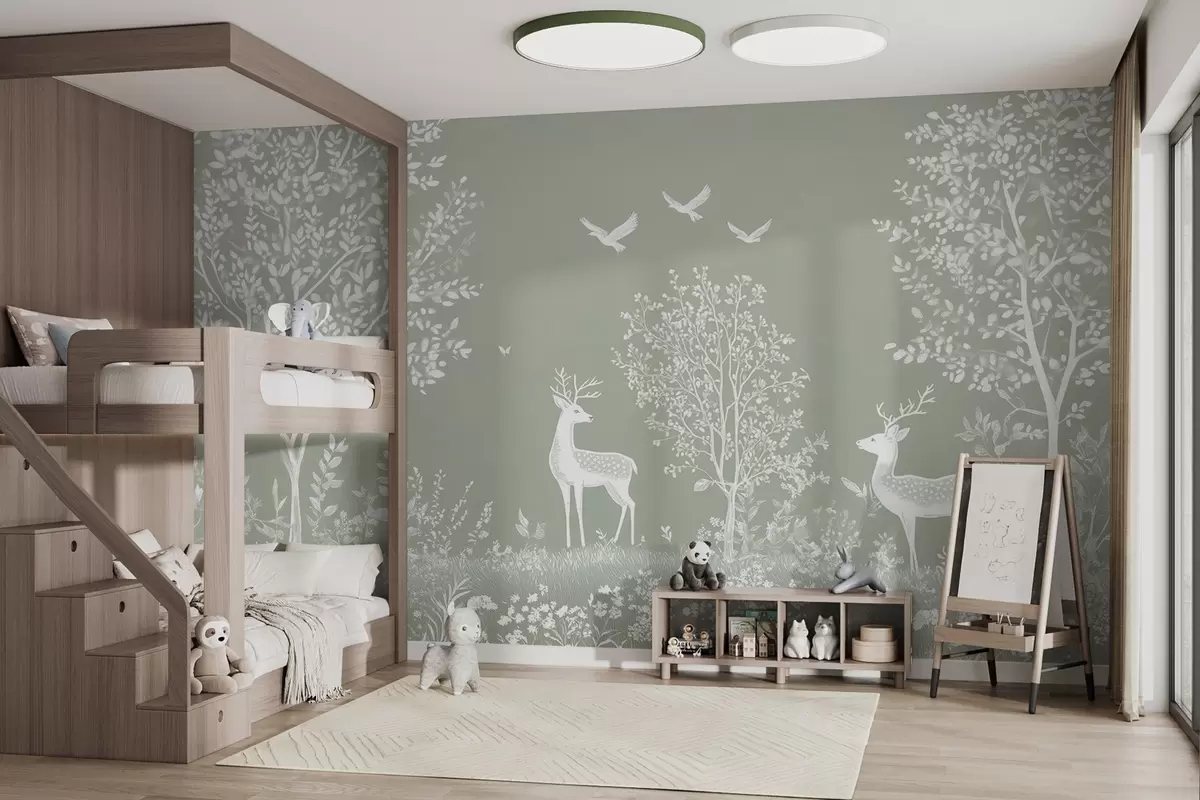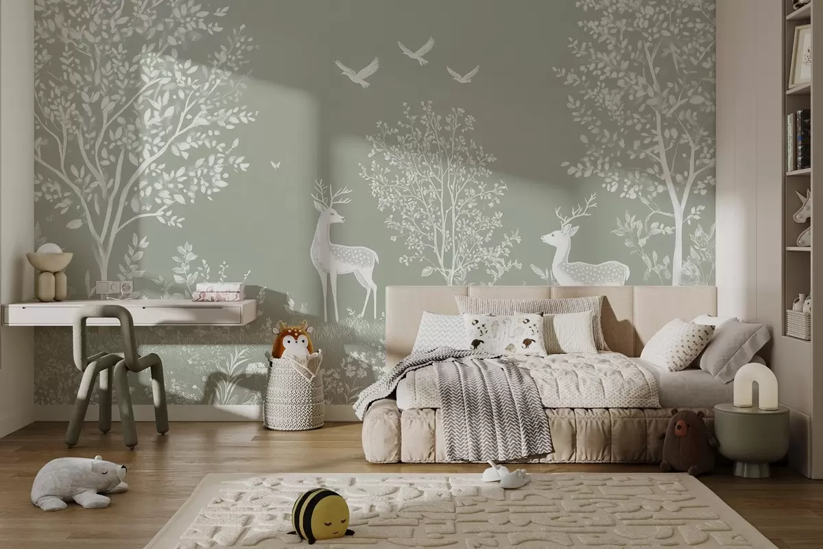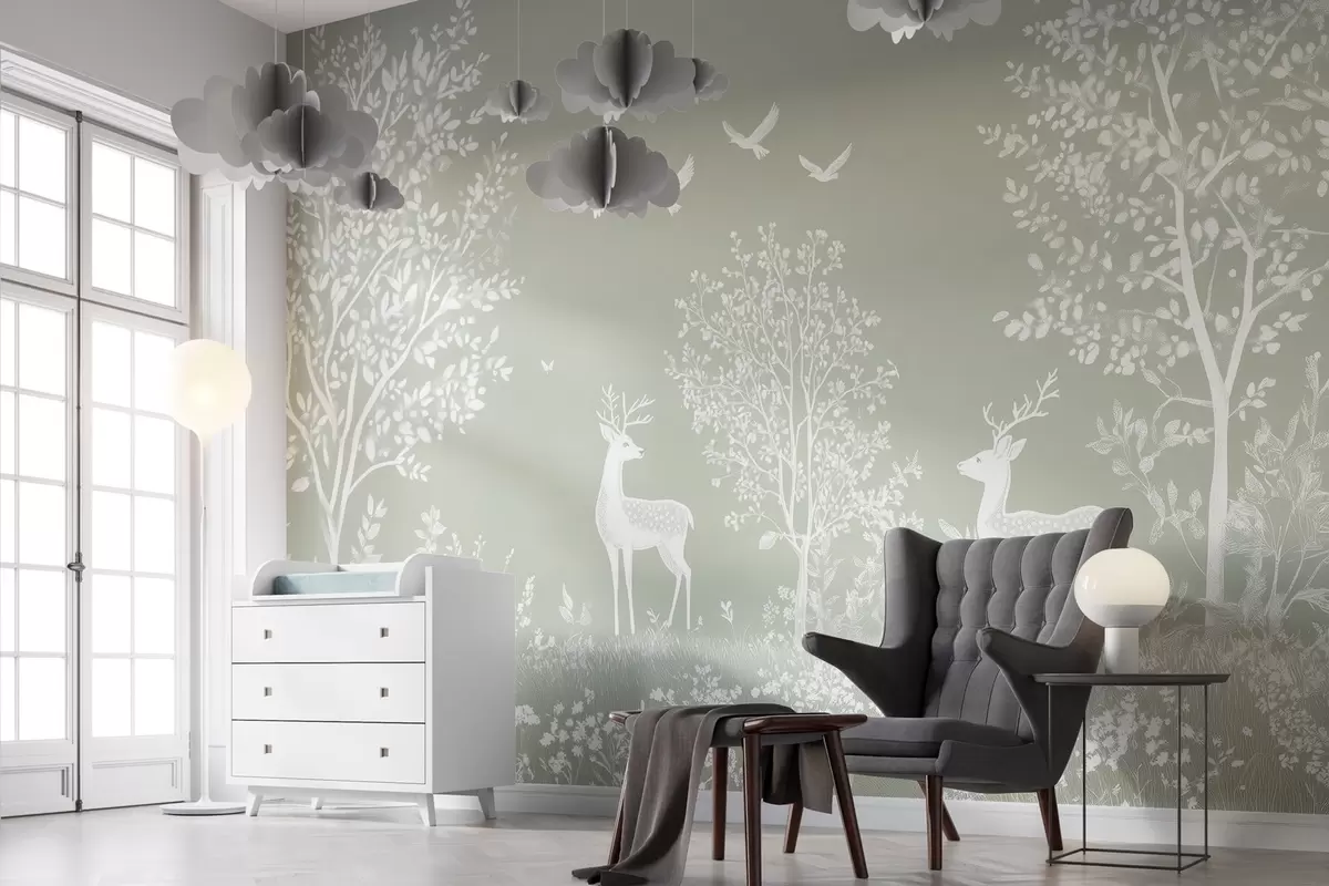 Fotomurales bosque con ciervos en el estilo de un dibujo a la tiza sobre un fondo de oliva Nr. w02444v1