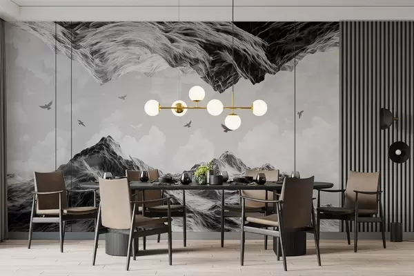 Fotomurales Paisaje de montaña, realismo, pájaros volando, naturaleza, nubes, colores blanco y negro Nr. w02514