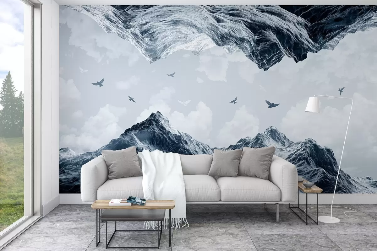 Fotomurales Paisaje de montaña, realismo, pájaros volando, naturaleza, nubes, colores azules Nr. w02514v1