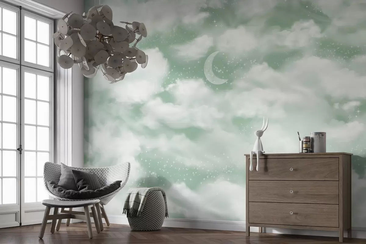 Fotomurales Cielo estrellado con luna y nubes, soñador, etéreo, colores verdes suaves Nr. w02515v2