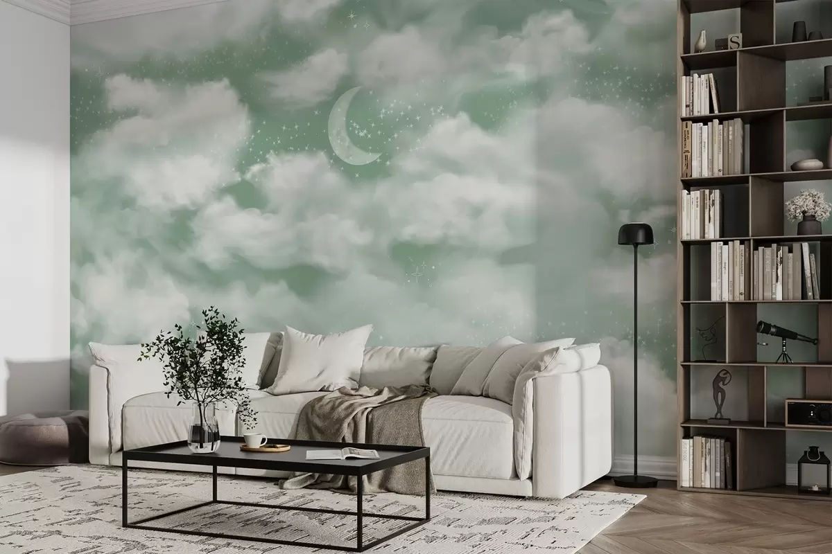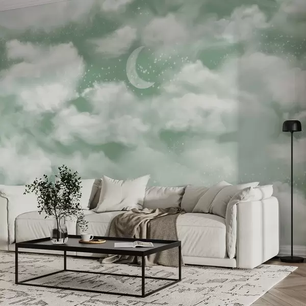 Fotomurales Cielo estrellado con luna y nubes, soñador, etéreo, colores verdes suaves Nr. w02515v2