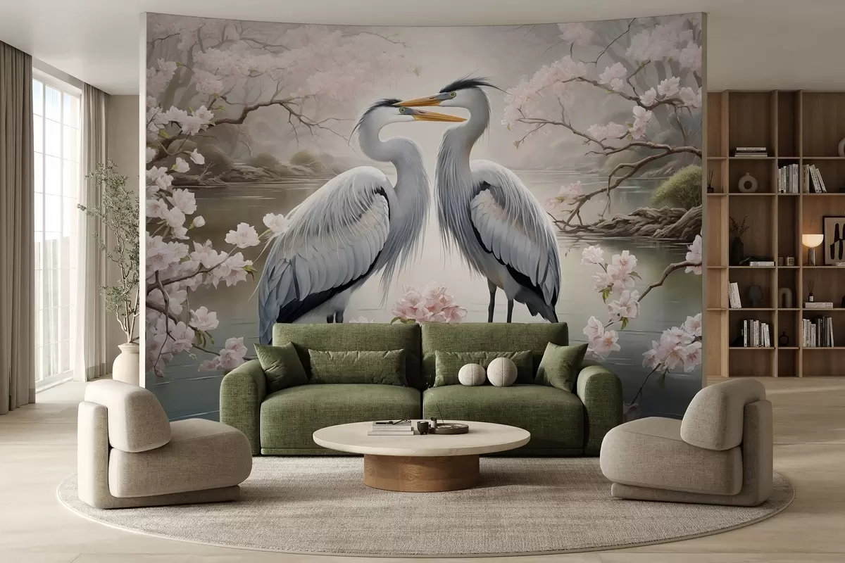 Fotomurales Una pareja de cigüeñas en un jardín en flor Nr. w02621