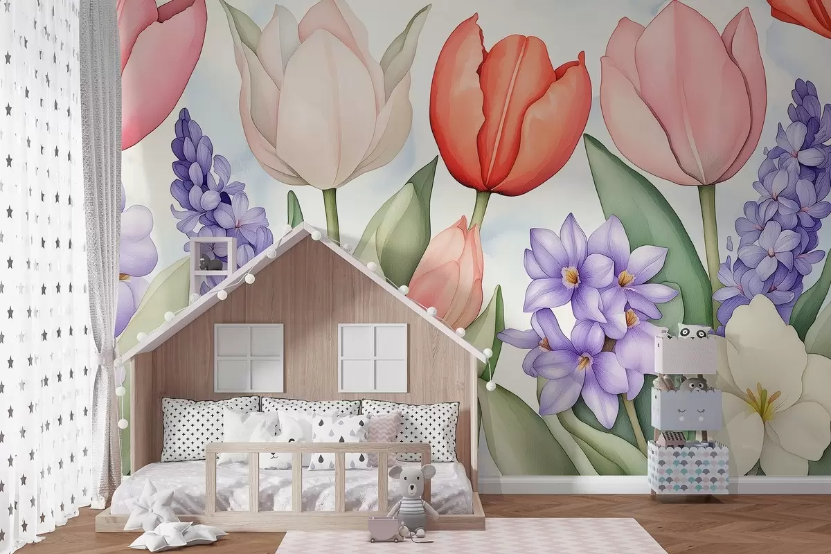 Fotomurales Flores de primavera, tulipanes, jacintos, dibujo estilo acuarela, floral Nr. w02940