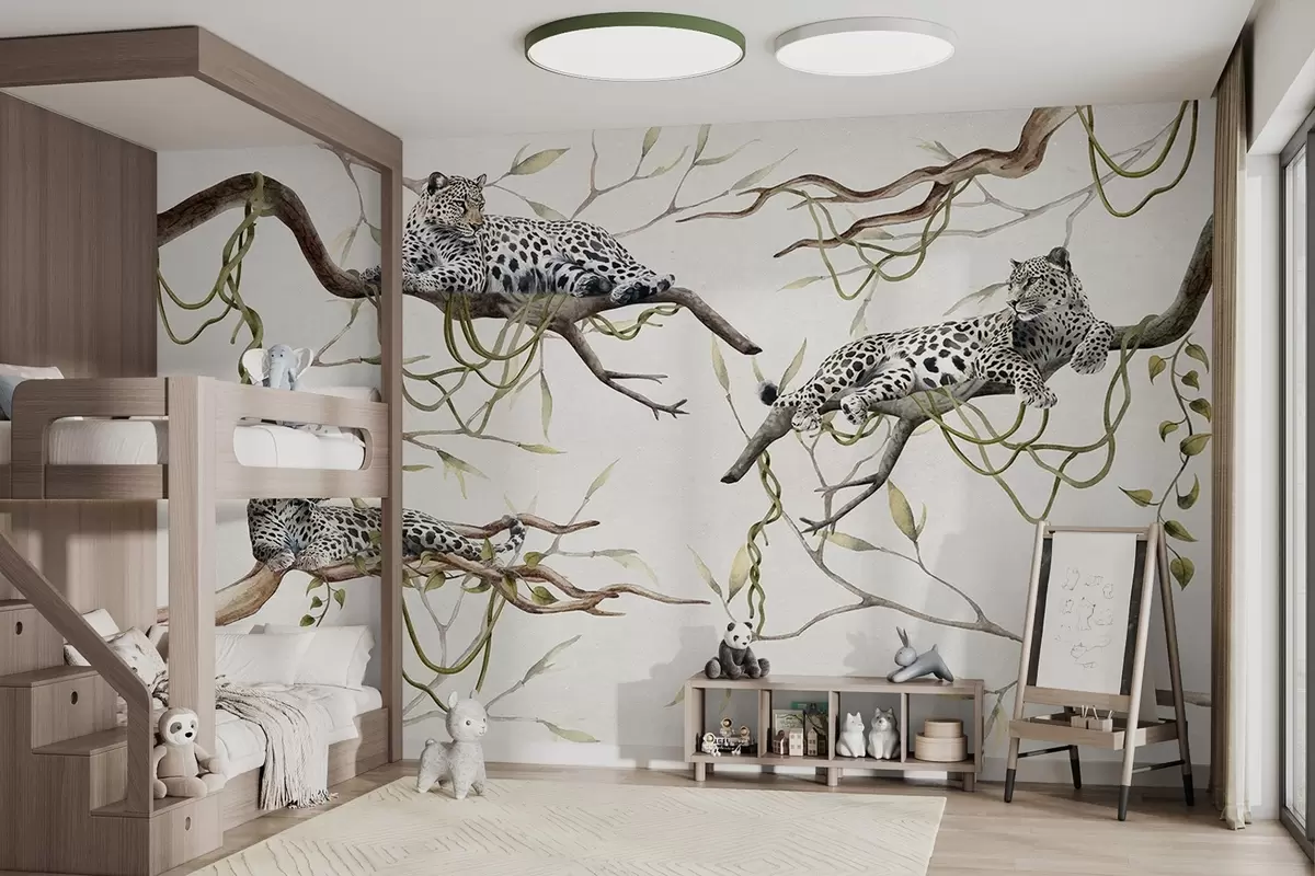 Fotomurales Leopardos en los árboles de la selva, lianas, tropical, animales salvajes, paleta de colores pastel Nr. w03146v4