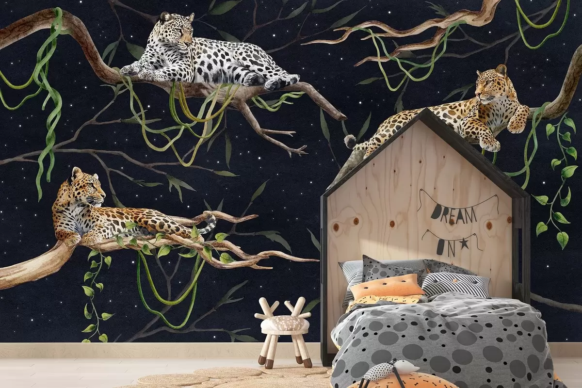 Fotomurales Leopardos en los árboles de la selva, lianas, tropicales, animales salvajes, cielo nocturno con estrellas Nr. w03148
