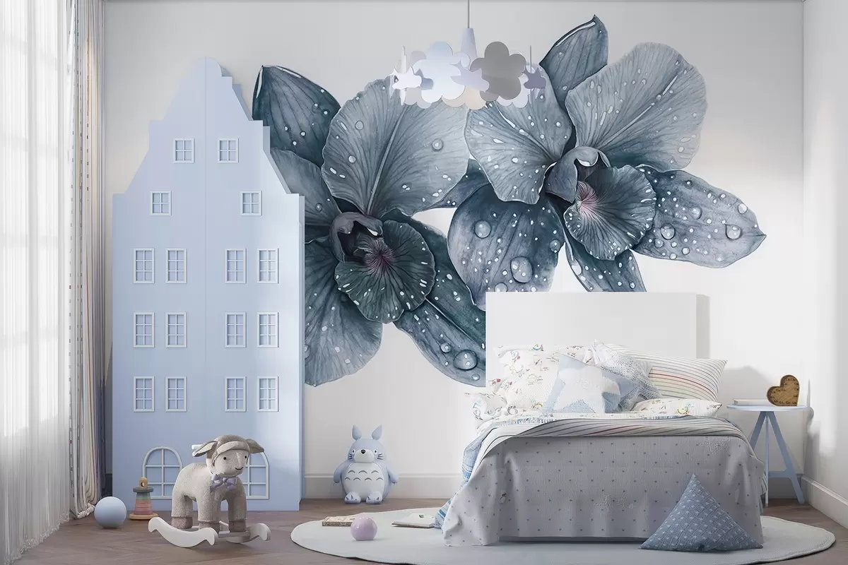 Fotomurales Hermosas flores de orquídea, dibujo estilo acuarela, colores azules Nr. w03164v2