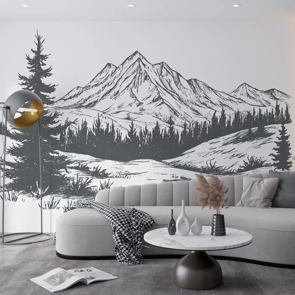 Fotomurales Paisaje de montaña con pinos, bosque, naturaleza, color gris oscuro Nr. w03344
