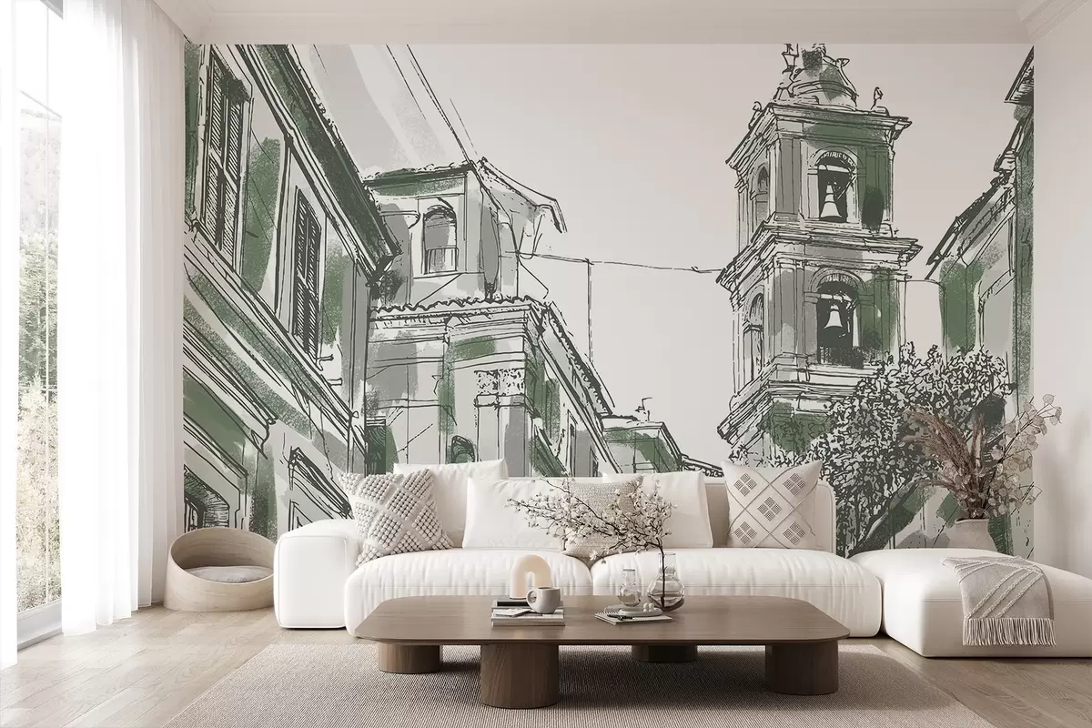 Fotomurales Calle de ciudad mediterránea, capilla, arquitectura, colores gris y verde Nr. w03350v2