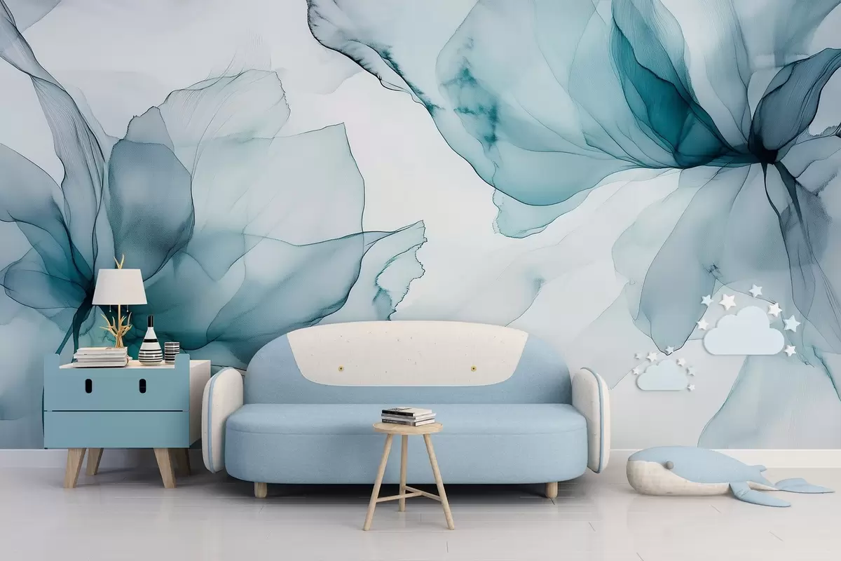 Fotomurales Flores de estilo fluido, abstracción floral, acuarela, paleta de colores azules Nr. w03406v2