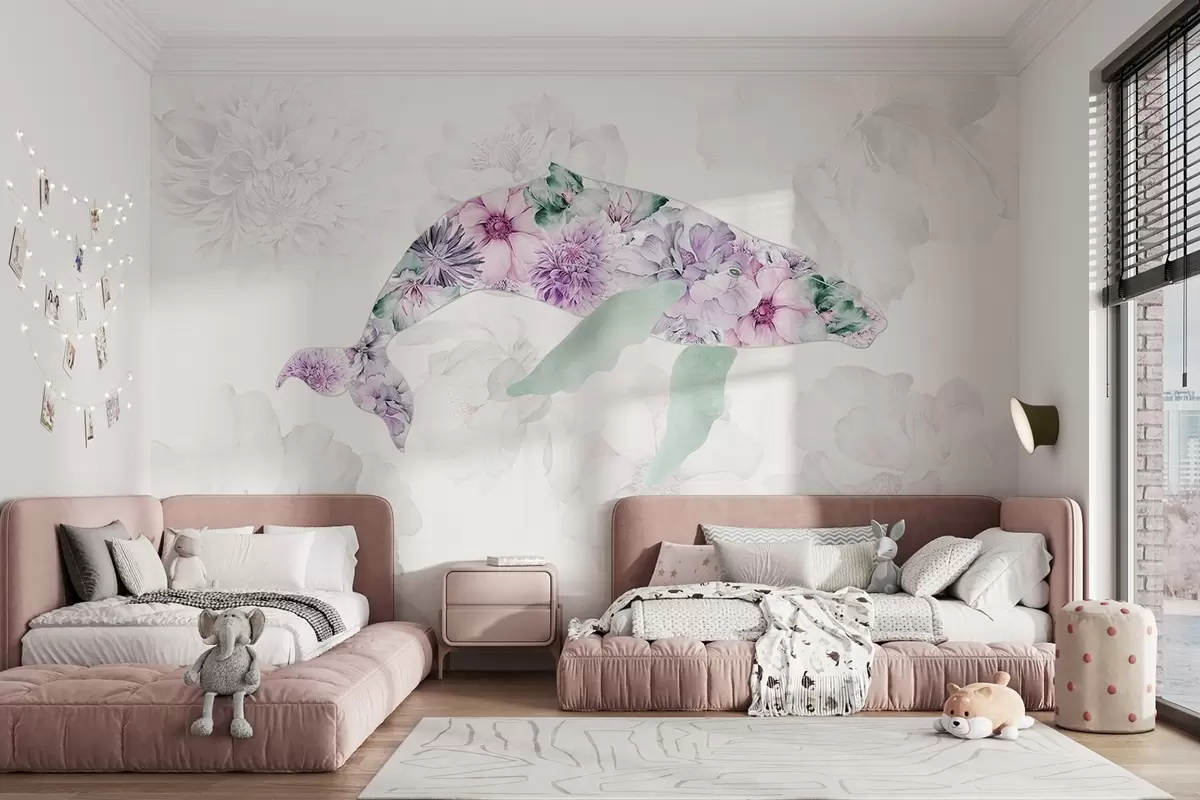 Fotomurales Ballena con flores de acuarela, animales del océano, minimalismo, rosa y verde Nr. w03446v1