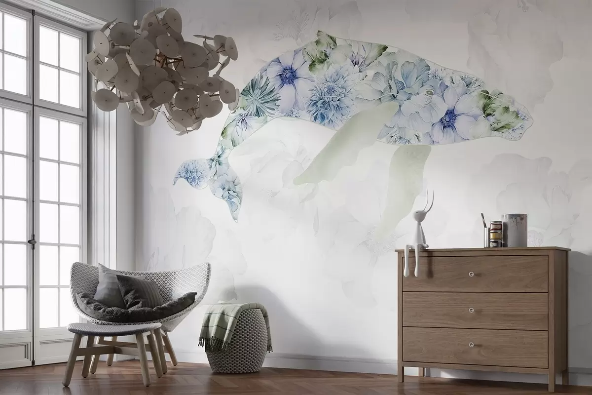 Fotomurales Ballena con flores de acuarela, animales del océano, minimalismo, azul y verde Nr. w03446v2
