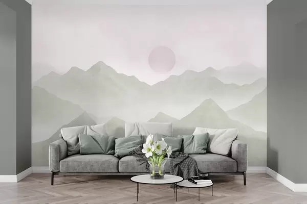 Fotomurales Paisaje de montaña estilo boho, puesta de sol, pastel suave, verde Nr. w03547