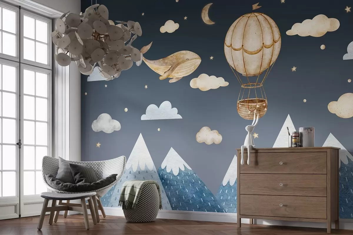 Fotomurales Globo de aire, linda ballena, cielo estrellado oscuro, montañas, acuarela, colores azul y beige Nr. w03672v1