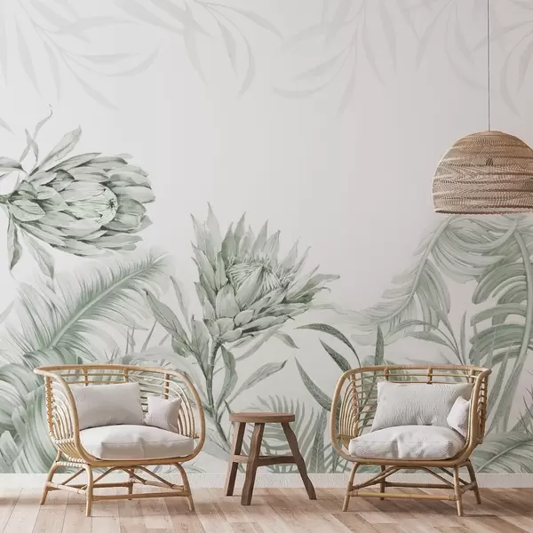 Fotomurales Protea entre hojas tropicales, tonos azules Nr. w03952v3