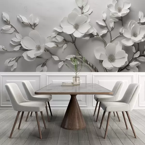 Fotomurales Rama floral dimensional en blanco puro y tonos neutros Nr. w04039v2