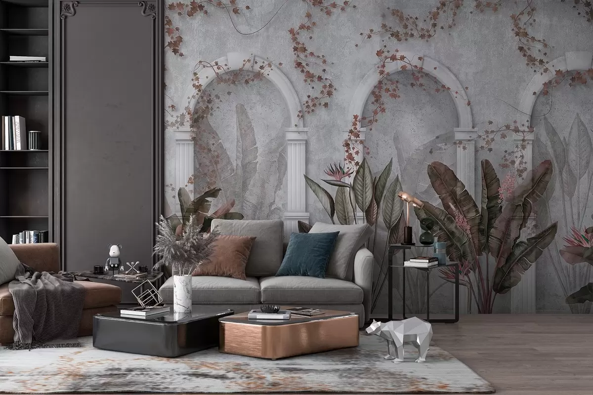 Fotomurales Muro de hormigón con arcos y plantas tropicales, florales, colores burdeos Nr. w04065v1