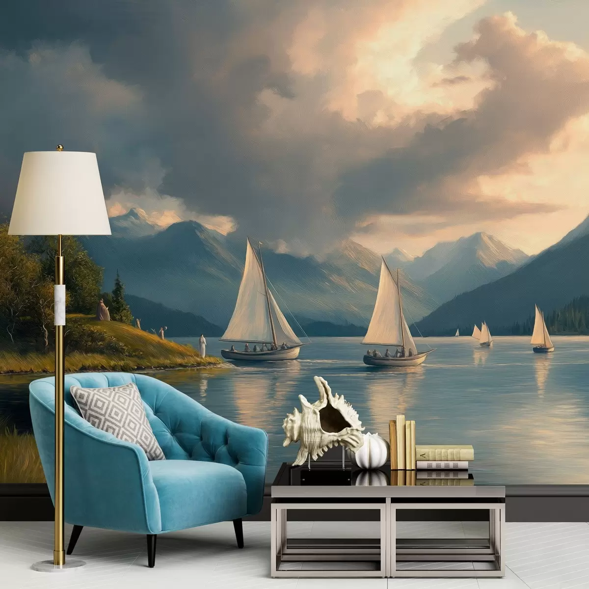 Fotomurales regata en un lago con cielo nublado al estilo de un óleo del siglo XIX Nr. w04076
