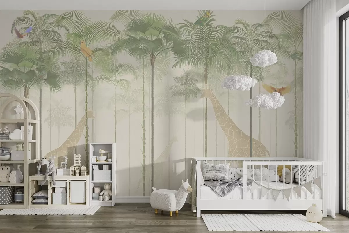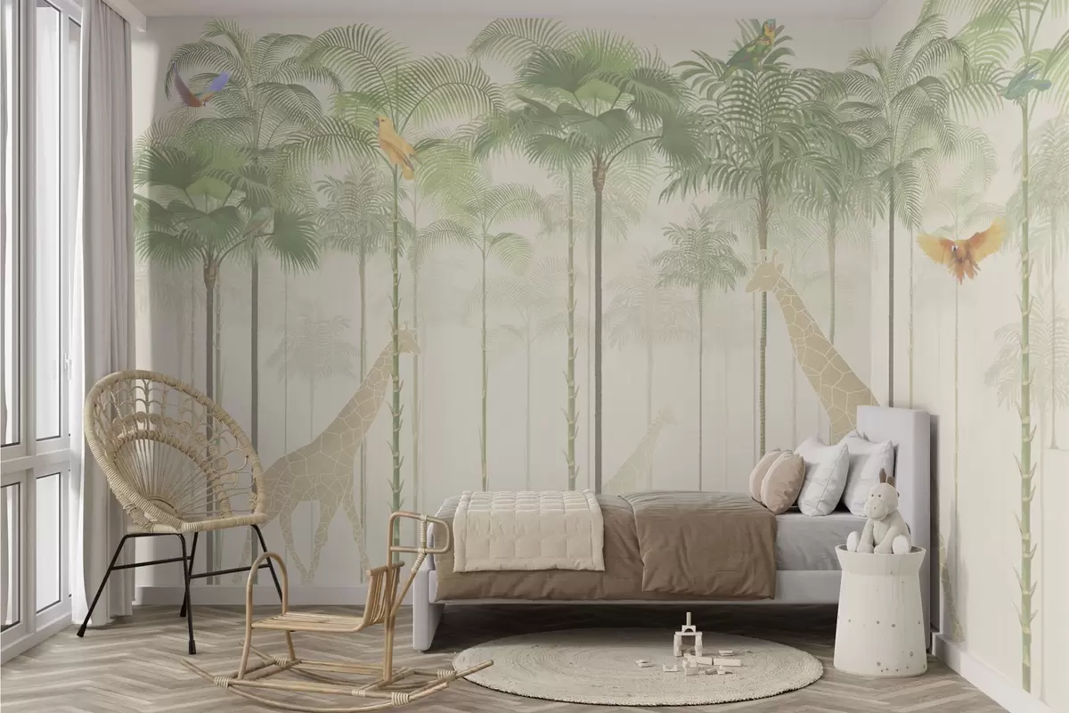 Fotomurales Jirafas y aves tropicales entre altas palmeras Nr. w04400