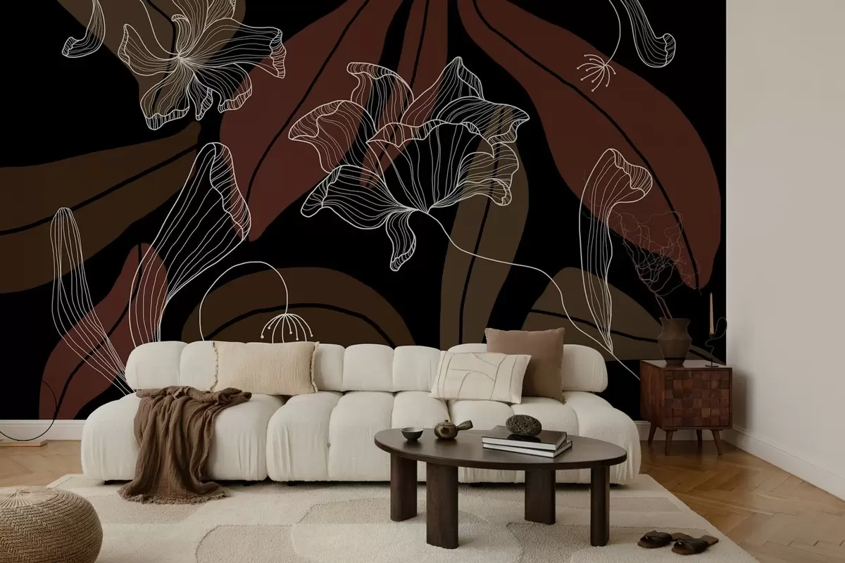 Fotomurales hojas y flores abstractas en tonos empolvados y beige sobre un fondo oscuro Nr. w04499v3