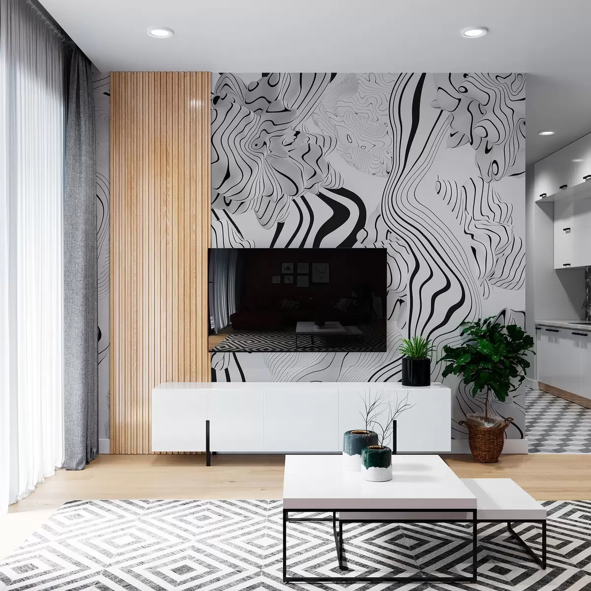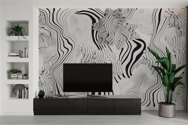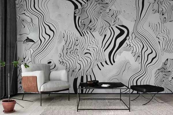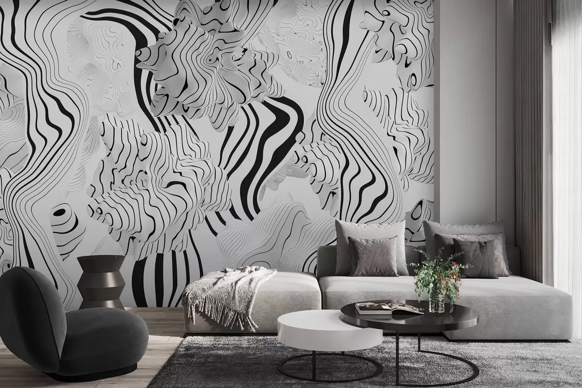 Fotomurales formas orgánicas abstractas en estilo 3D en tonos blancos y grises con rayas negras Nr. w04627