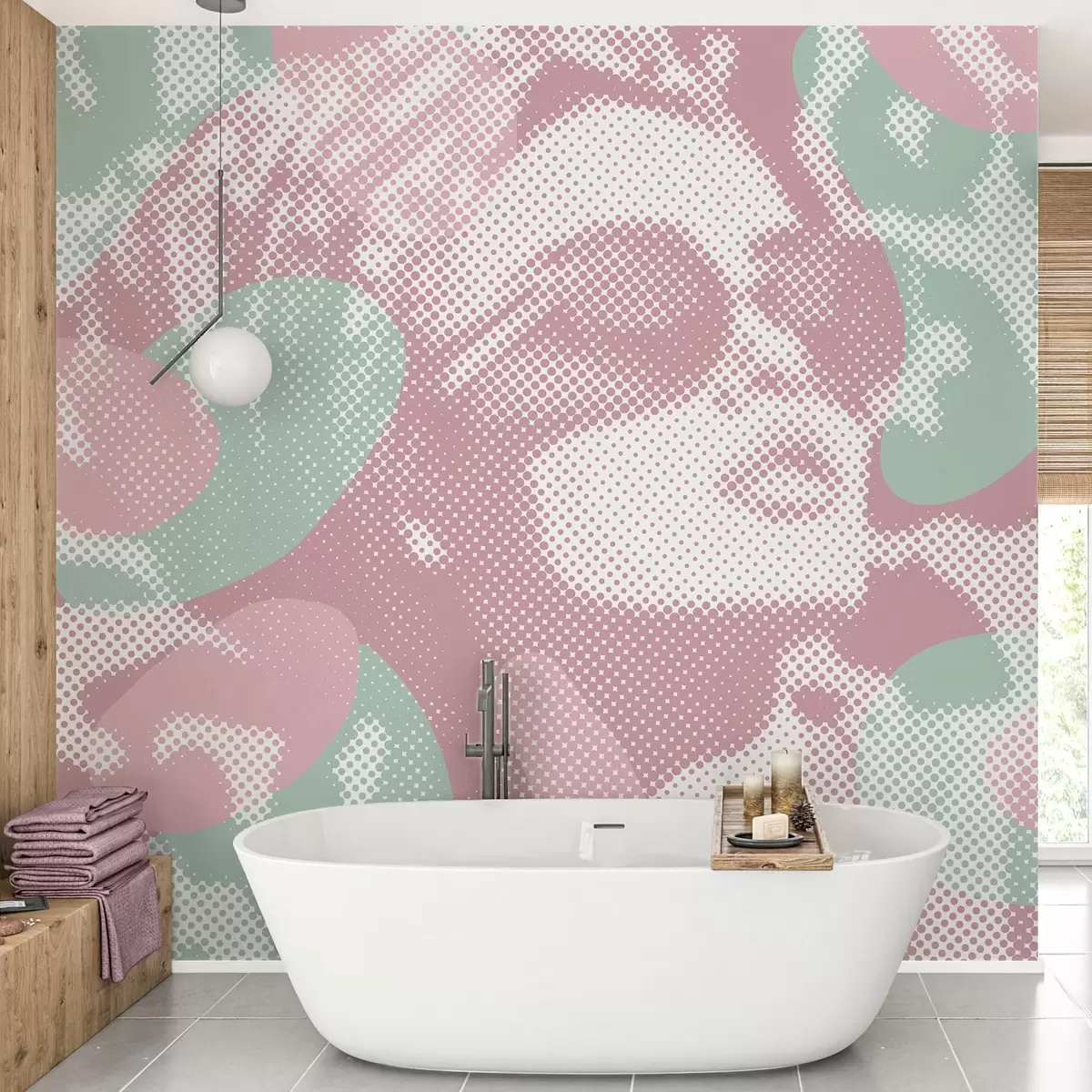 Fotomurales retrato de una mujer sobre un fondo de leopardo en estilo punteado en tonos rosas y verdes Nr. w04630v2