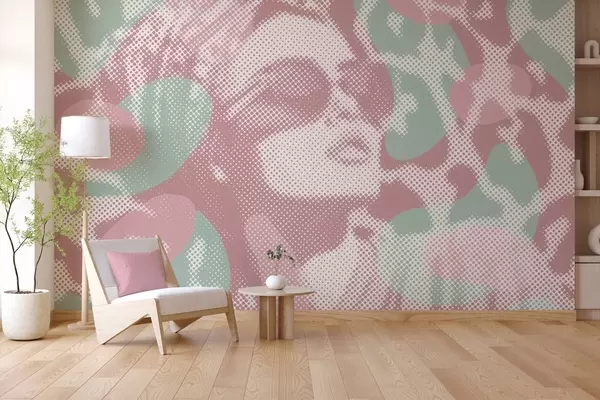 Fotomurales retrato de una mujer sobre un fondo de leopardo en estilo punteado en tonos rosas y verdes Nr. w04630v2