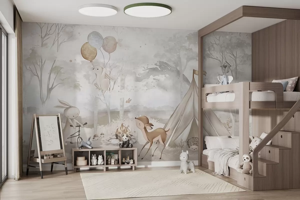 Fotomurales Campamento infantil en cálidos tonos beige, con tienda de campaña y animales del bosque Nr. w04671