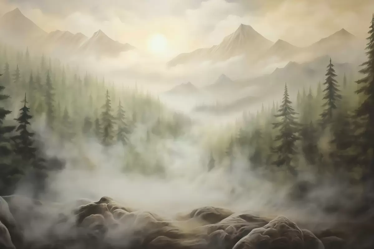 Fotomurales Bosque en la niebla con las montañas como telón de fondo Nr. w04730