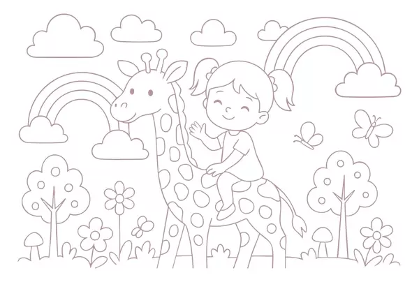 Fotomurales dibujo en blanco y negro de una niña sobre una jirafa al estilo de un libro para colorear infantil Nr. w04753