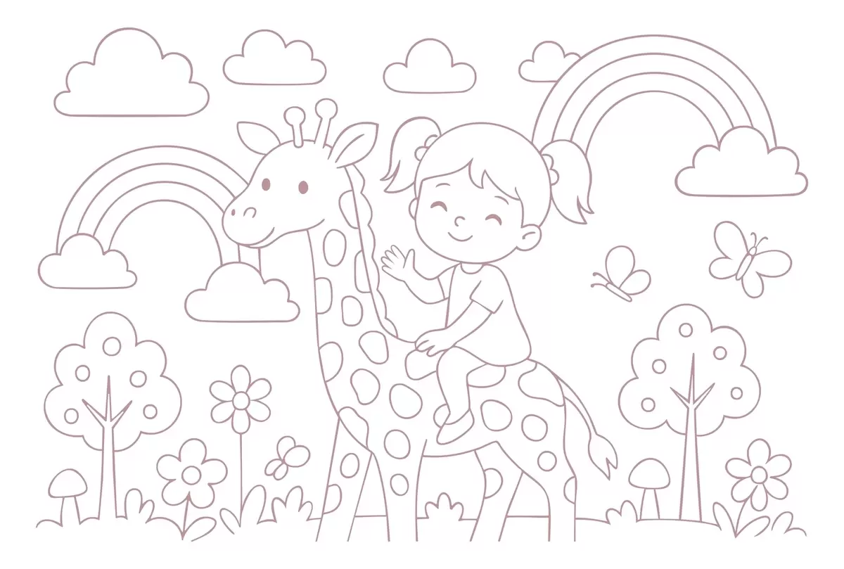 Fotomurales pintura en polvo de una niña sobre una jirafa al estilo de un libro para colorear infantil Nr. w04753v1