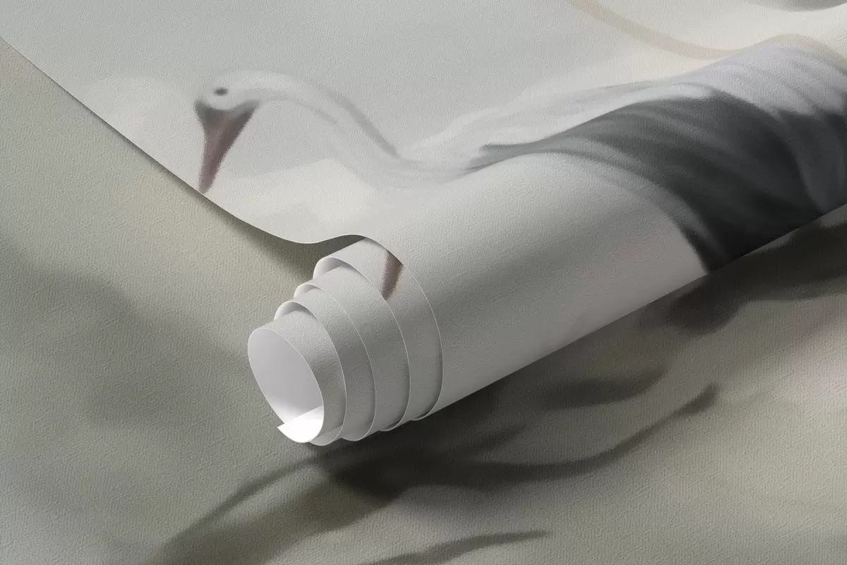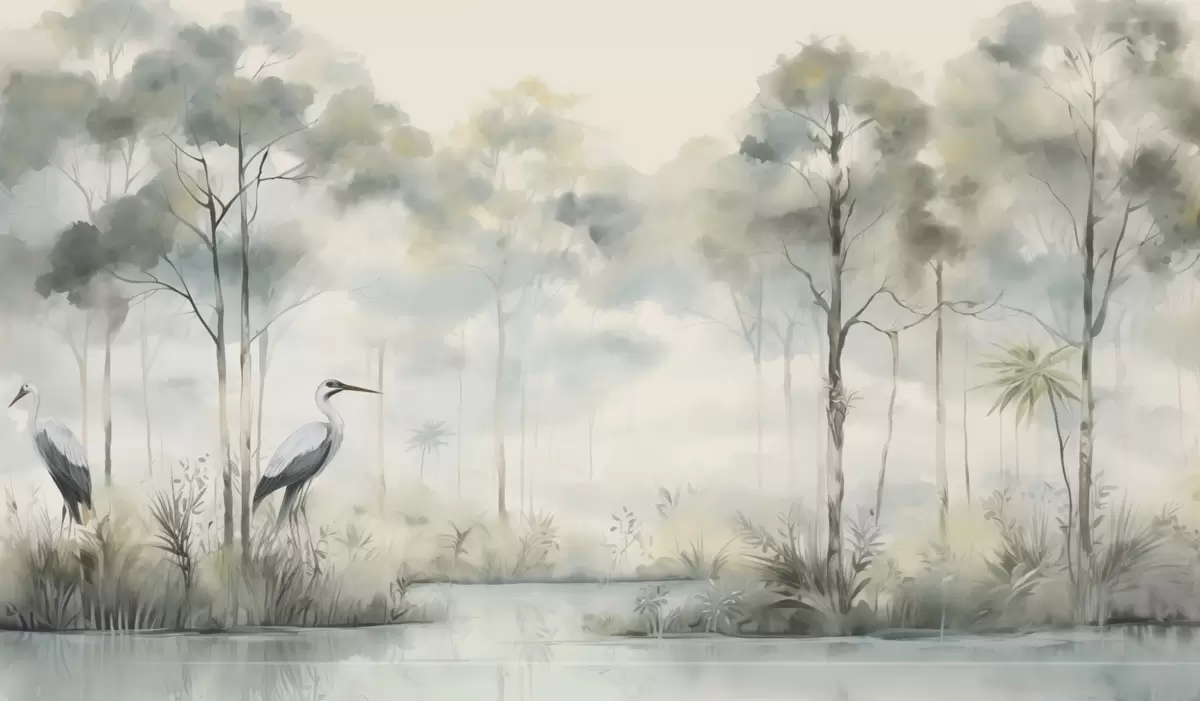 Fotomurales Bosque brumoso junto al agua con garzas, paleta de colores suaves y fríos. Nr. w04788