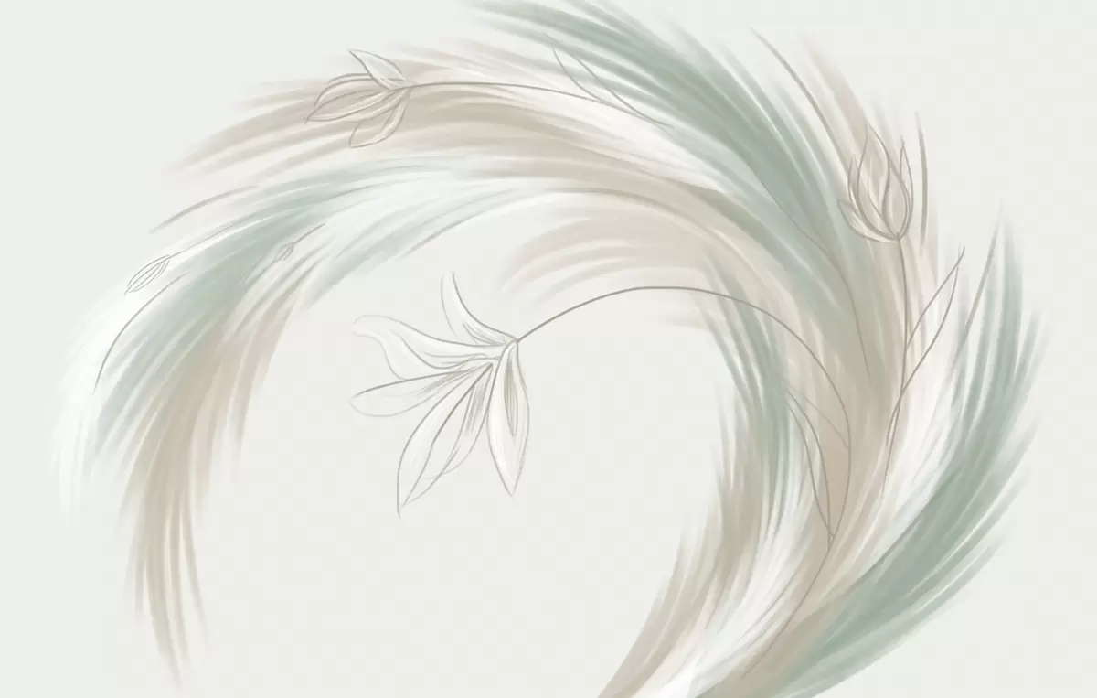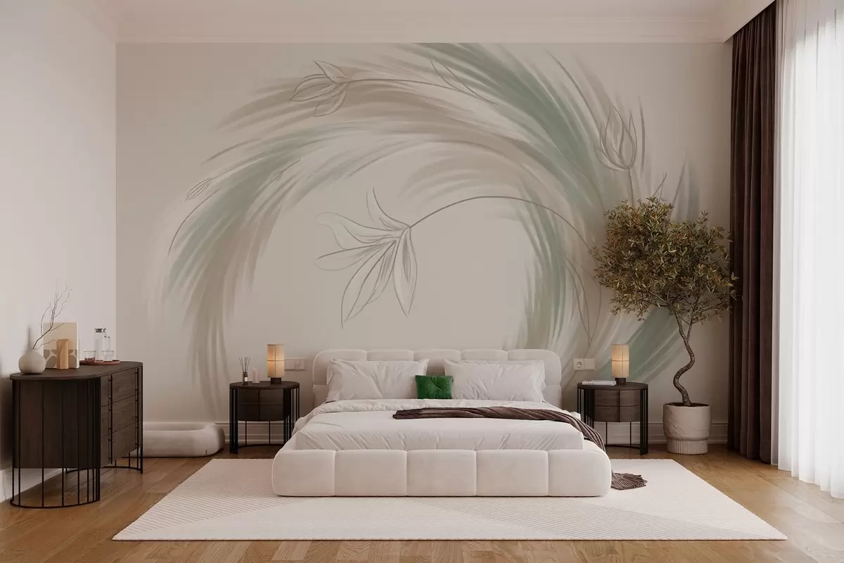 Fotomurales Plumas y flores verdes y beige, pintadas a mano. Nr. w04816