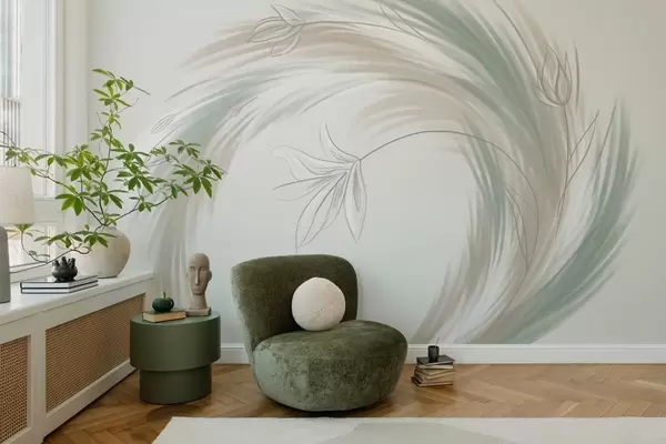 Fotomurales Plumas y flores verdes y beige, pintadas a mano. Nr. w04816