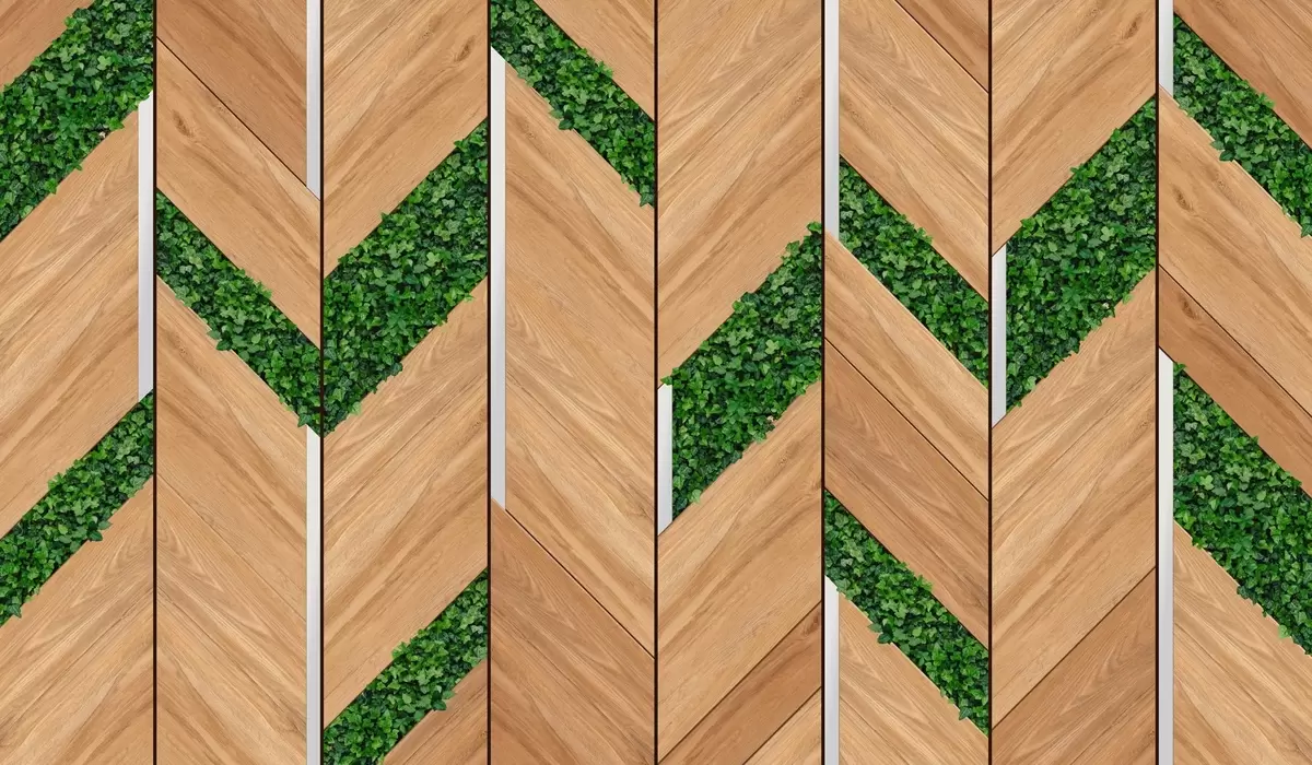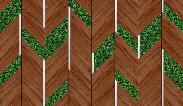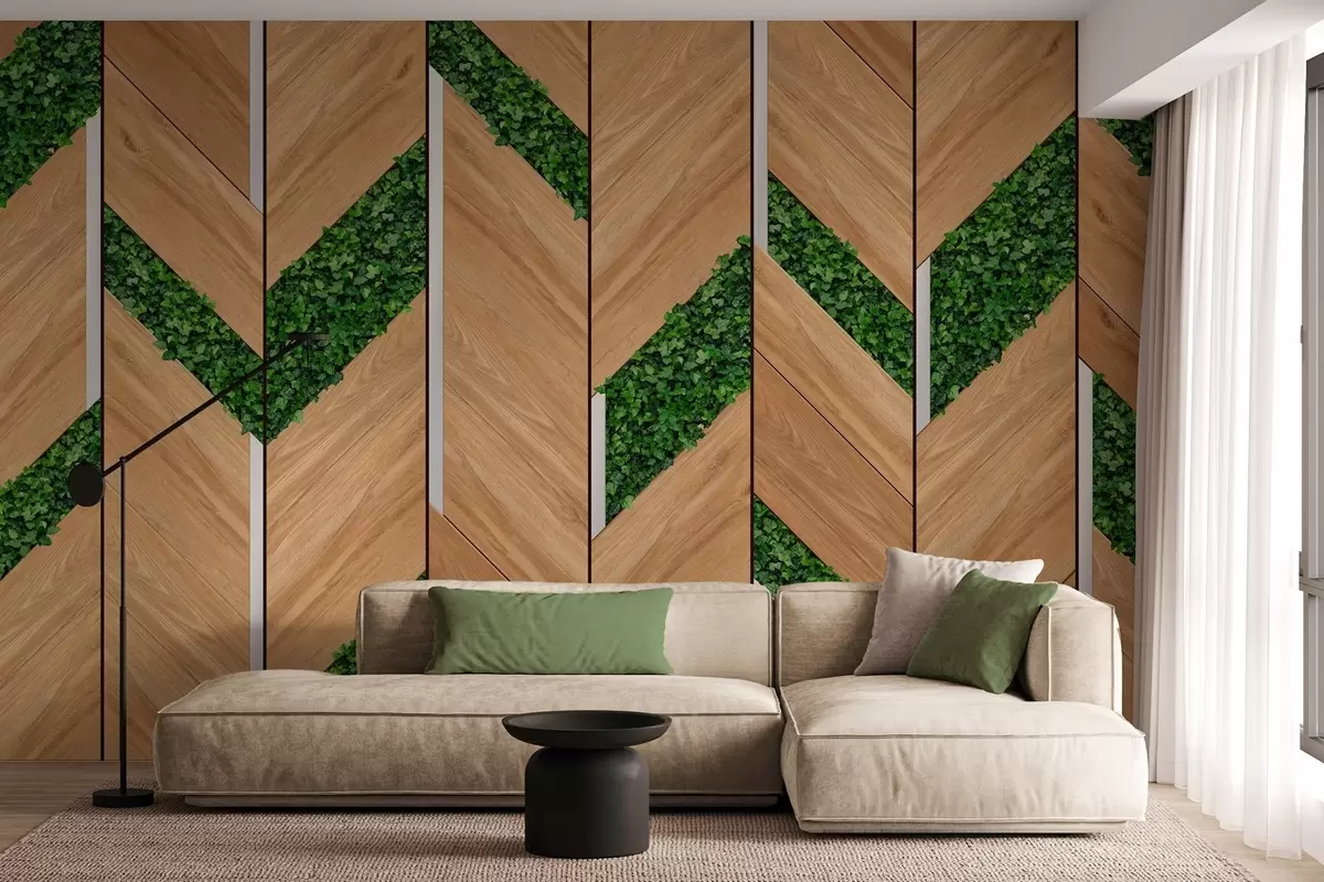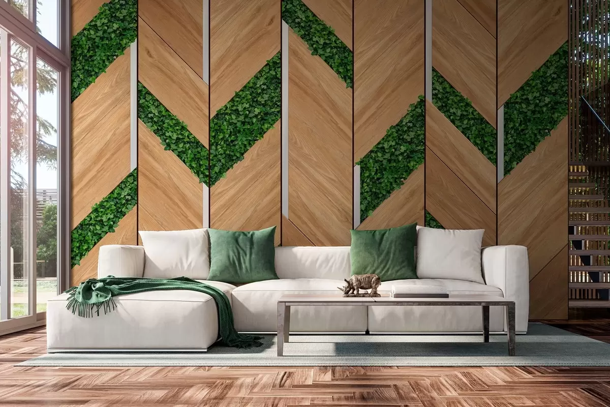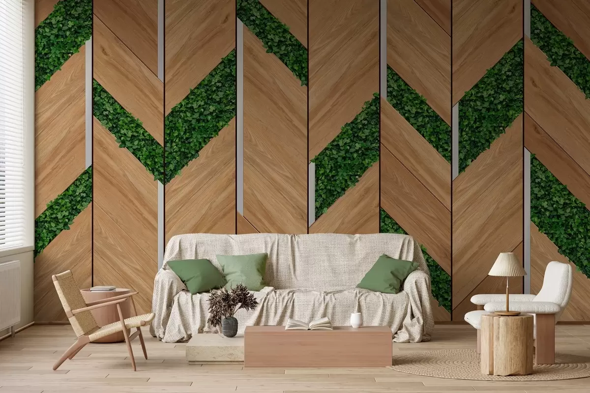 Fotomurales imitación de paneles de madera clara con inserciones vegetales Nr. w04875