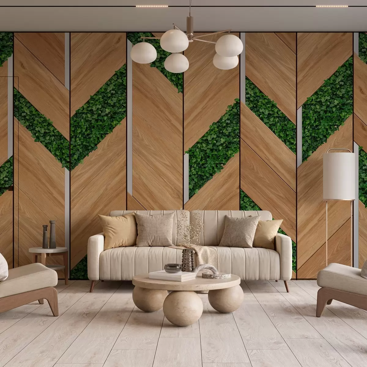 Fotomurales imitación de paneles de madera clara con inserciones vegetales Nr. w04875