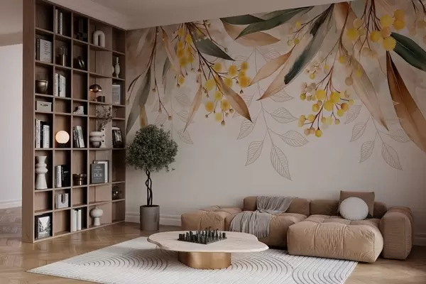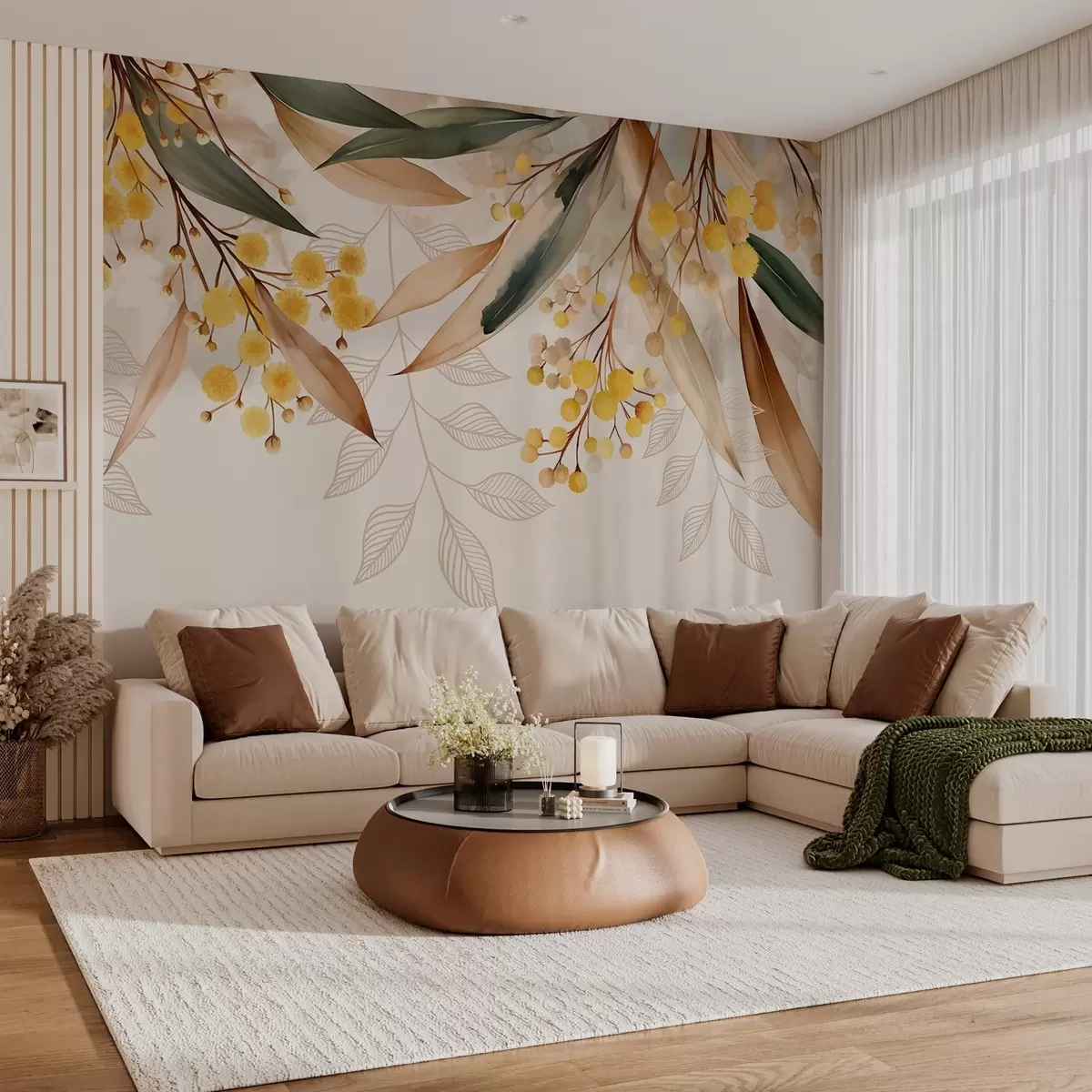 Fotomurales flores y hojas de mimosa cayendo desde arriba en estilo acuarela Nr. w04880