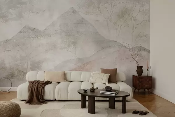 Fotomurales Montañas y árboles en tonos pastel suaves envueltos en una ligera niebla Nr. w04954