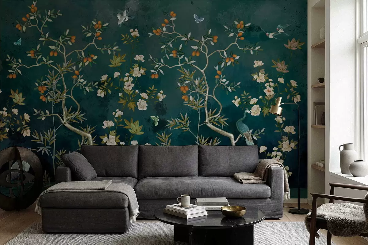 Fotomurales Escena decorativa con árboles, flores y pájaros sobre fondo oscuro. Nr. w05004