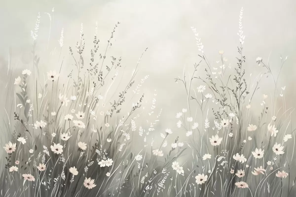 Fotomurales Suave escena de pradera con flores blancas y delicadas hierbas. Nr. w05015v1