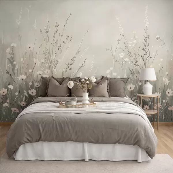 Fotomurales Suave escena de pradera con flores blancas y delicadas hierbas. Nr. w05015v1