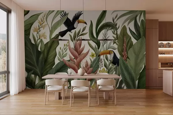 Fotomurales Plantas tropicales y aves de pico grande sobre fondo claro Nr. w05088v1