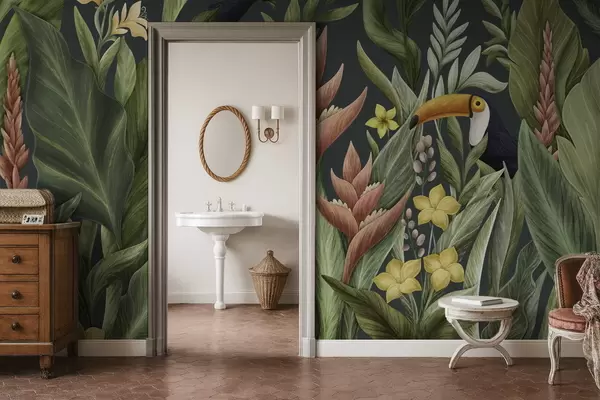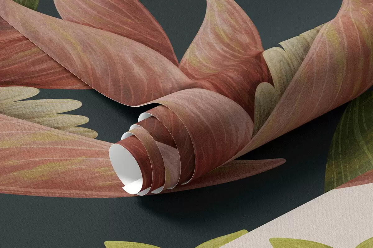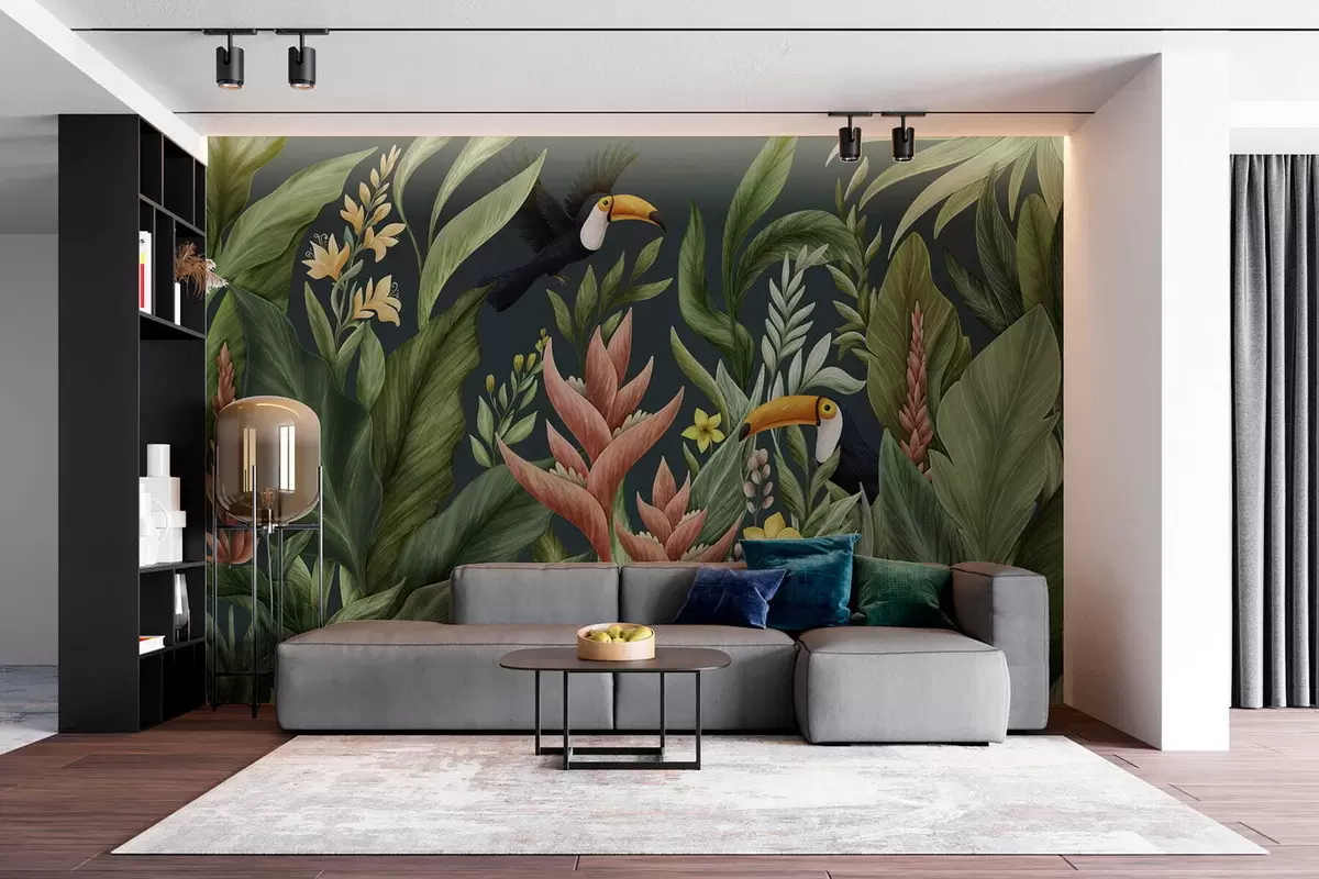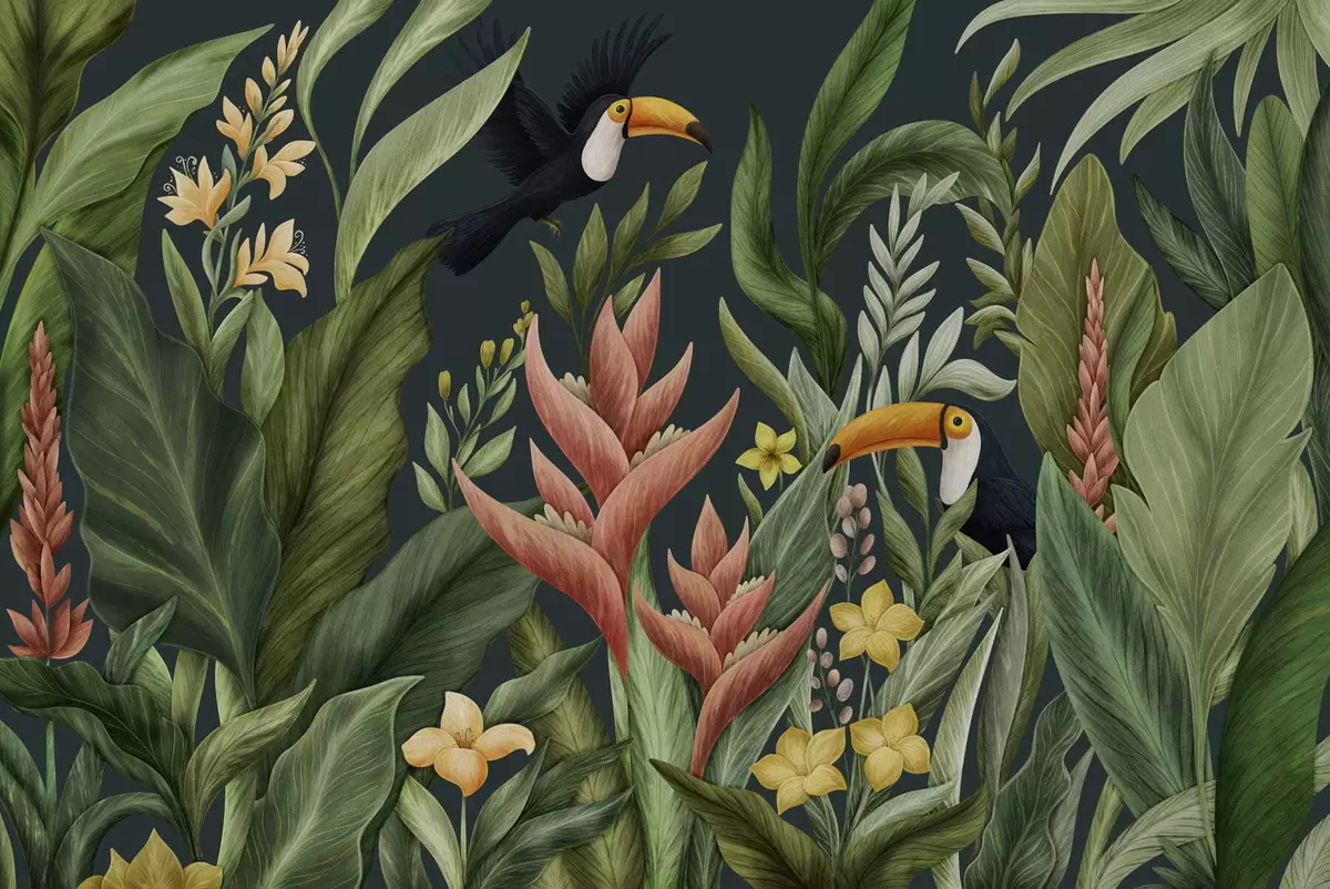 Fotomurales Plantas tropicales y aves de pico grande sobre fondo oscuro Nr. w05088v2