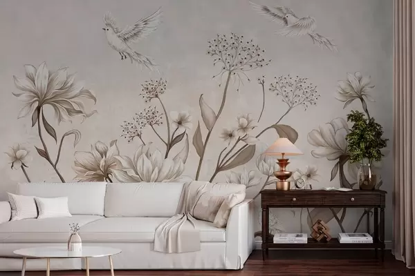 Fotomurales Flores claras y pájaros sobre un fondo suave Nr. w05118