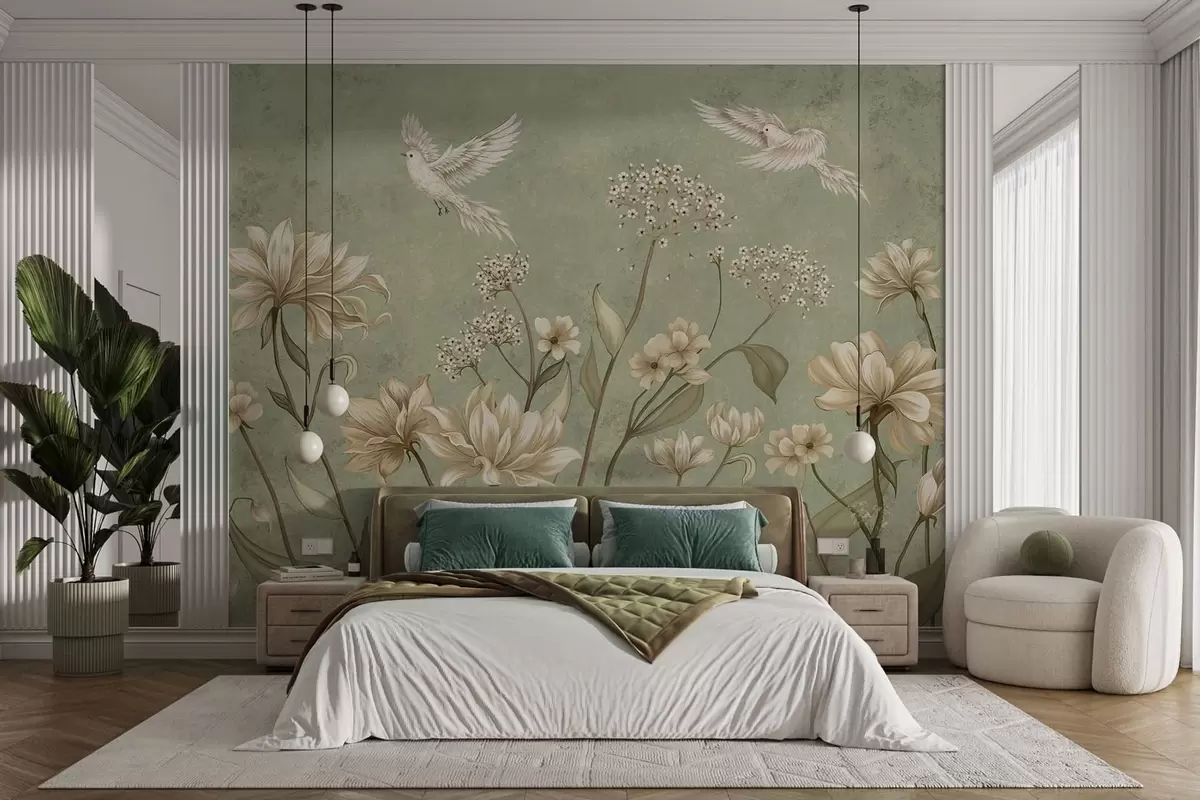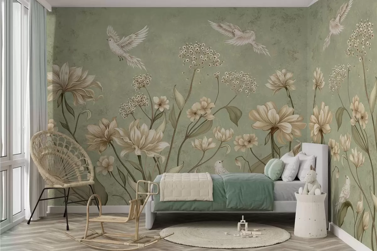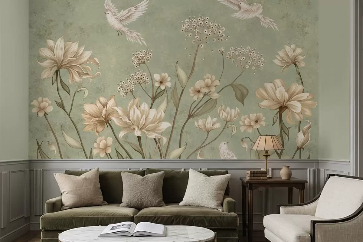 Fotomurales Flores y pájaros sobre un fondo verde con textura Nr. w05118v1