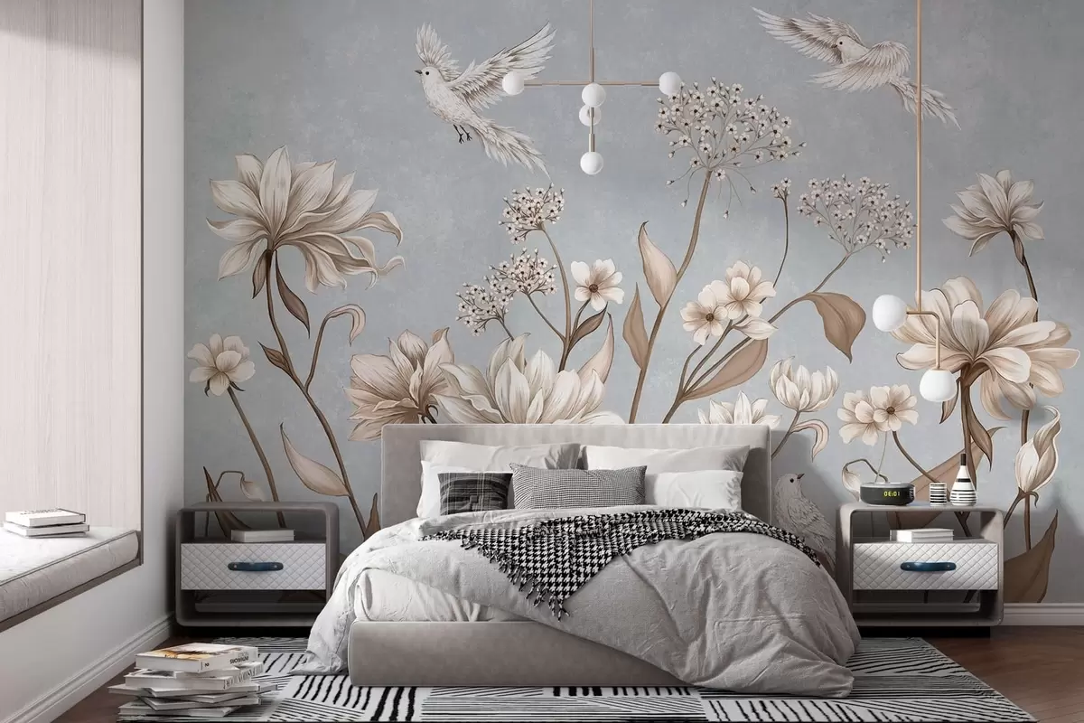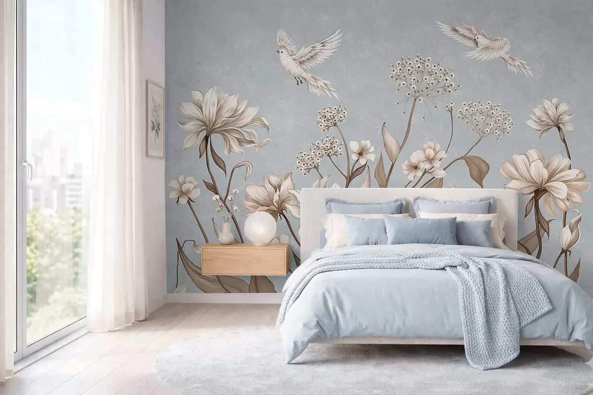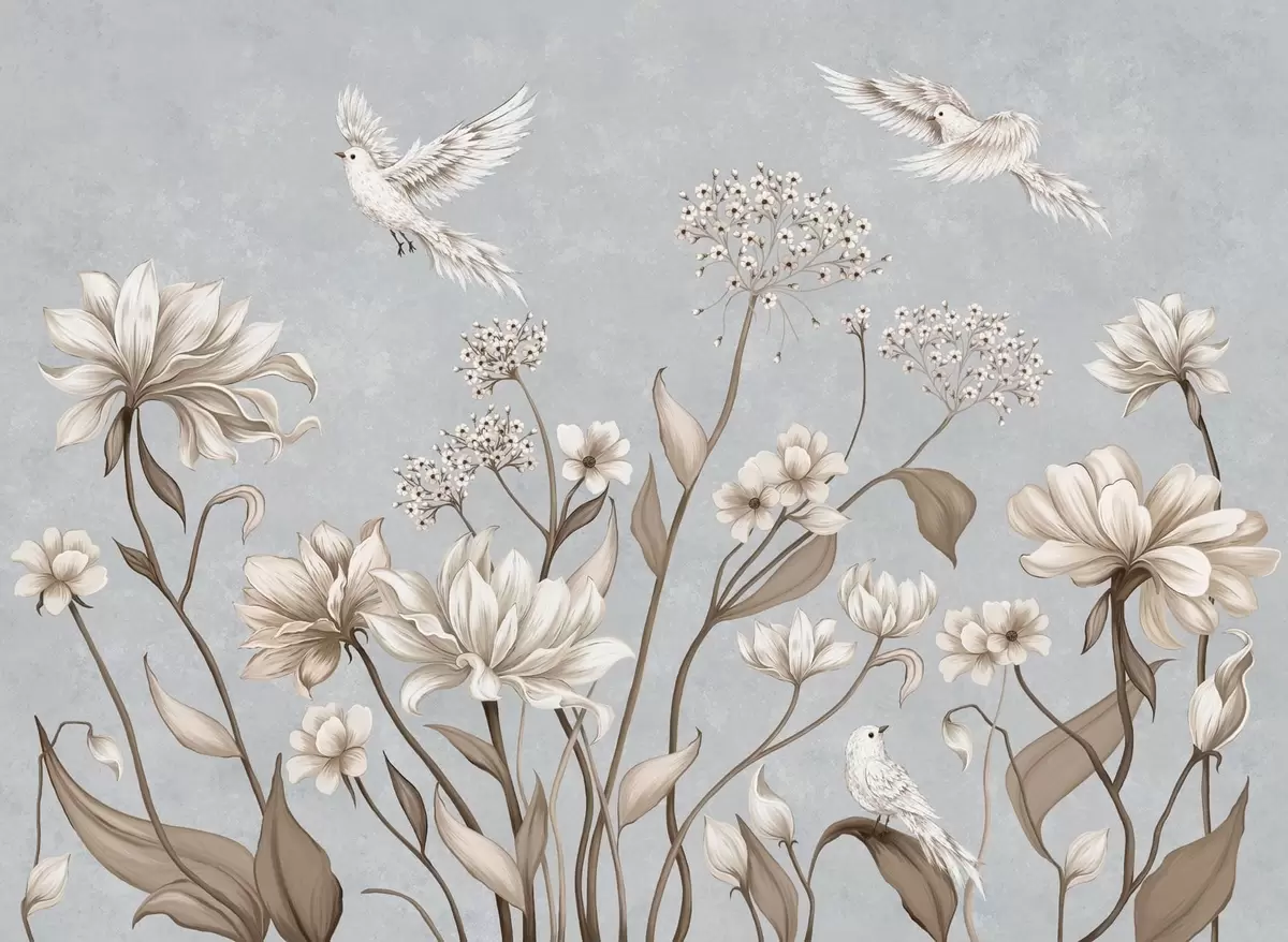 Fotomurales Flores y pájaros sobre un fondo gris azulado Nr. w05118v2