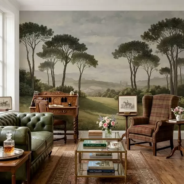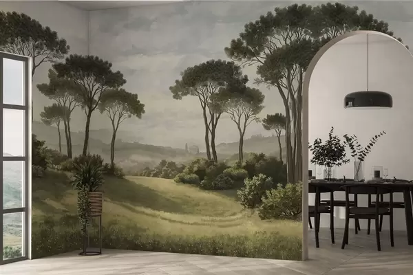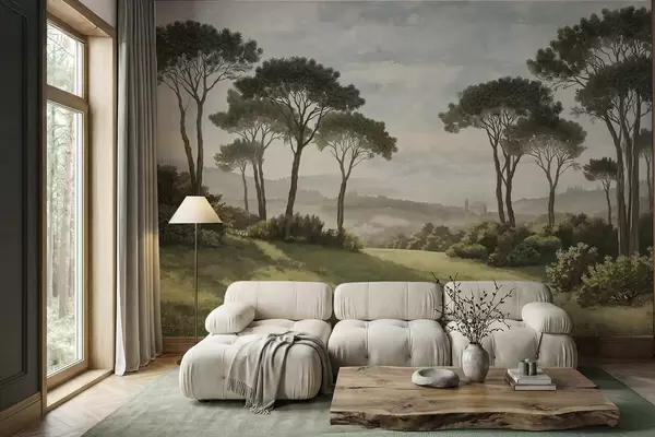 Fotomurales Paisaje con árboles, pradera y neblina en la lejanía Nr. w05122v1