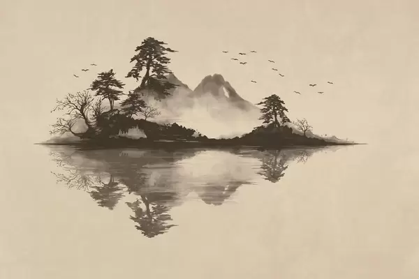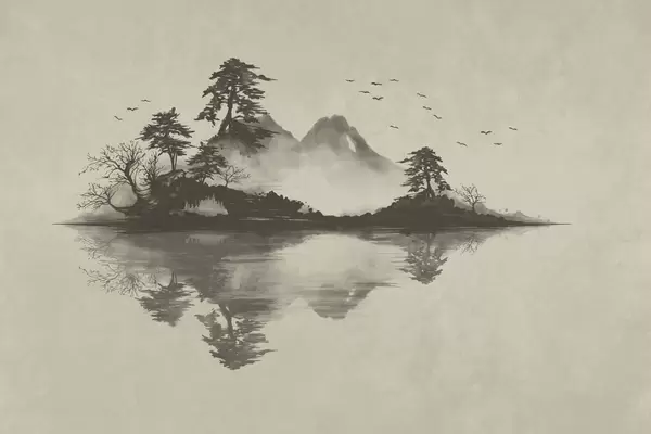 Fotomurales Paisaje montañoso en estilo sumi-e en suaves tonos grises Nr. w05124v1